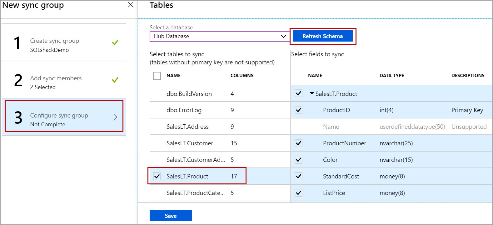 To add the tables to a sync group, click on the configure sync group as shown in the below image and select the Hub database. Click on Refresh Schema to list the tables in the hub database. select the table you want to replicate and click on Save.