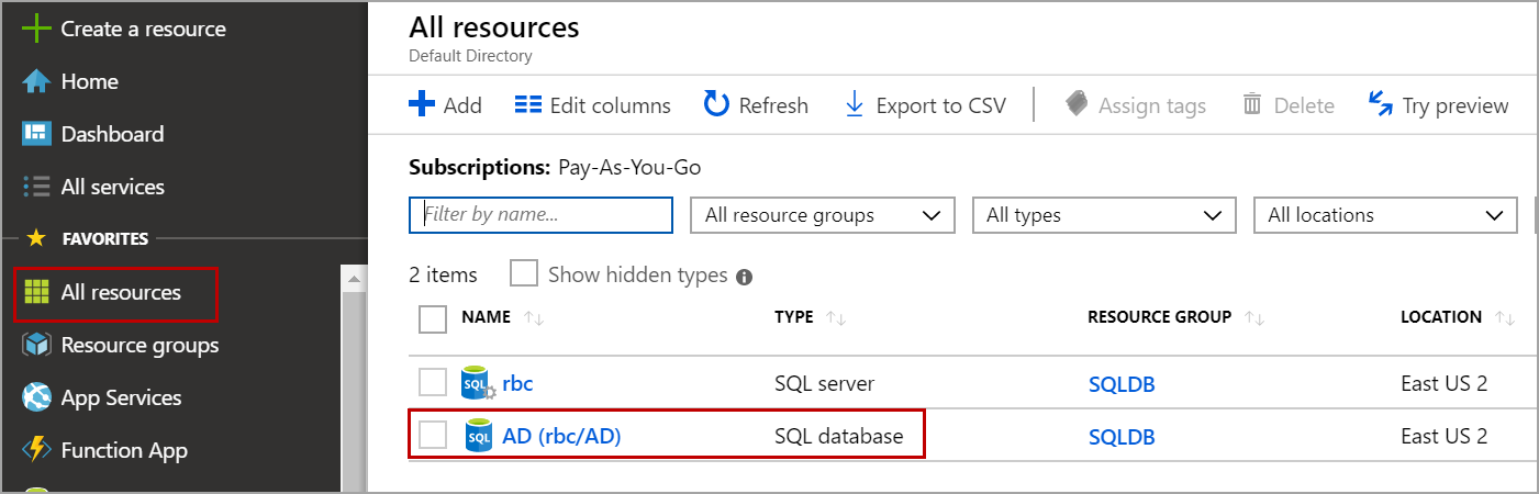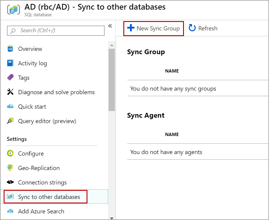 To create a sync group, Navigate to All resources page or SQL databases page and click on the database which will act as a hub database.