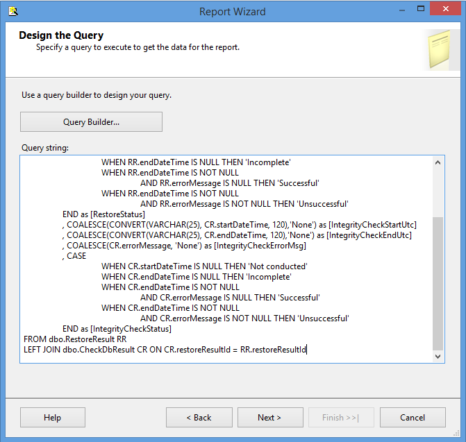 At this point the report mechanism becomes a matter of personal choice or organization standards. Some organizations have existing SQL Server Reporting Services (SSRS) implementations, others might be using Crystal Reports, or there could be an existing in-house support application and all this query needs is a view or stored procedure to call its home. For the purposes of demonstration, the basic steps for exposing this data via an SSRS report are shown.