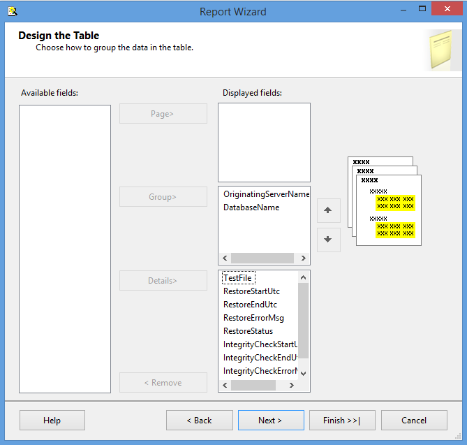On this step Karla can pick and choose how she wants the report formatted. For the demonstration OriginatingServerName and DatabaseName were selected for the Group section and all other fields as Details.