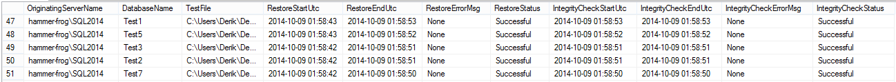 As can be seen, restore evidence can be retrieved with minimal concerns. So why should Karla create new tables? Because enough concerns with the integrity checks are present to need its results logged, and having the evidence of the restores linked to the integrity checks will make for a clearer data set for the reports.