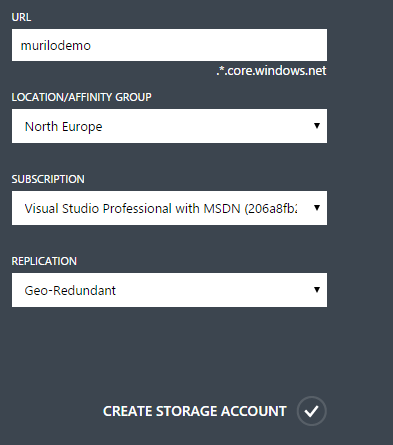 This solution is based on Azure Storage account, so the first step would be create an Azure Storage account. In order to perform this, just go to the Azure Portal and select New > Data Services > Storage > Quick Create