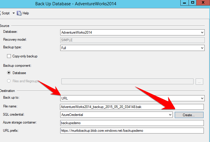 In the backup configuration panel, select the option to Backup to URL and click in the “Create” button (PS: In the image, I already have a credential created):