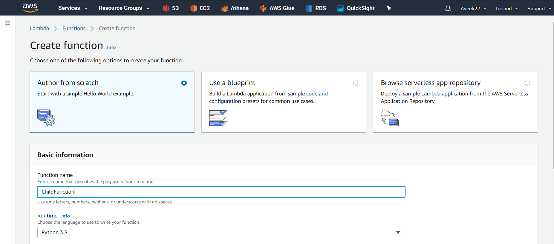 Let the name of this function be – “ChildFunction” and select Python 3.8 as the runtime.