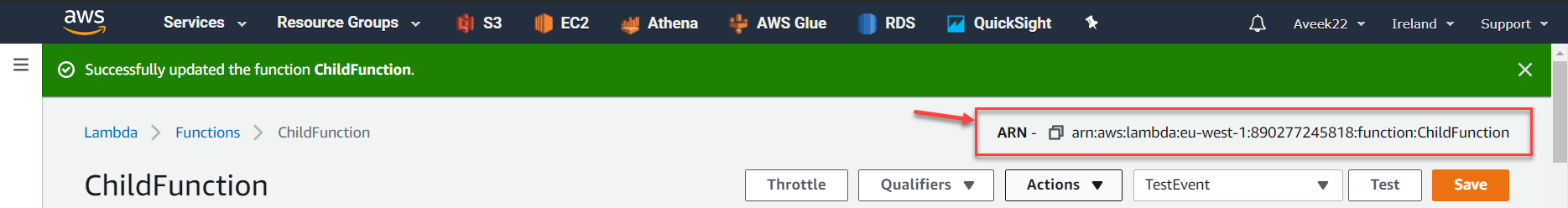 Also, copy the ARN of the Child Function, which can be used later to apply for policies and roles upon.
