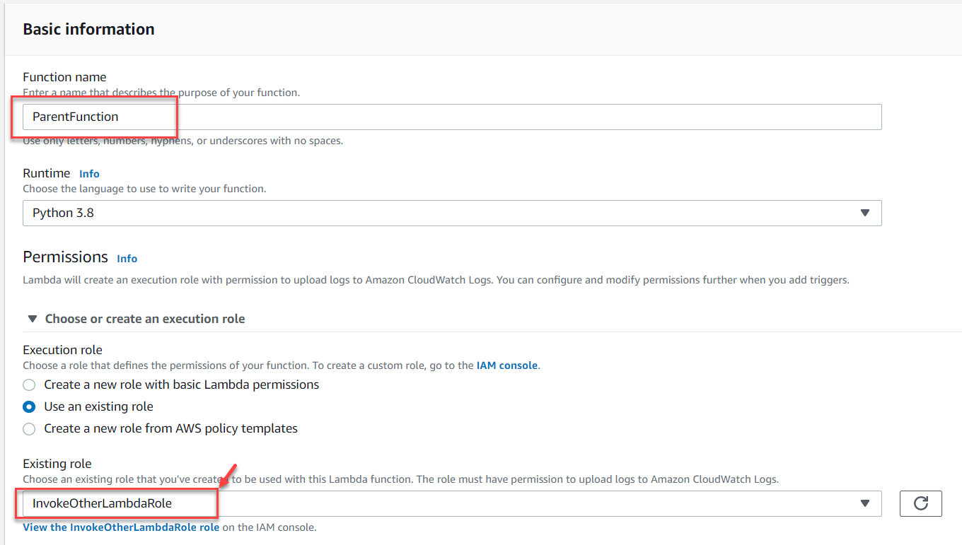 Head over to the Lambda Function page and click on Create New Lambda function. I am calling this lambda function – “ParentFunction”. Choose the run time as Python 3.8 and assign the InvokeOtherLambdaRole role that we just created in the previous step.