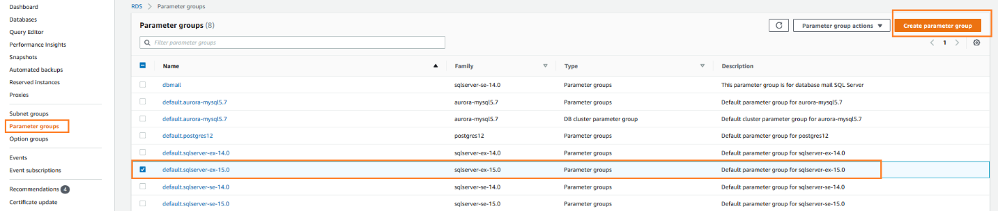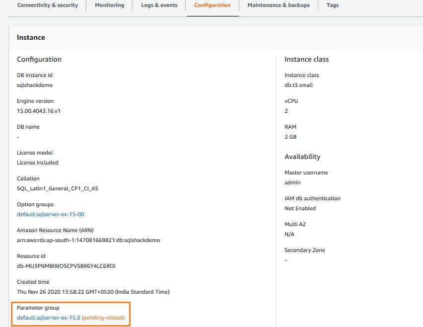 AWS RDS instance uses a parameter group for the default configuration of a SQL instance. This parameter group varies depending upon the SQL Server version, edition. In the RDS dashboard, to view the parameter group, click on the Configuration and note-down the parameter group.