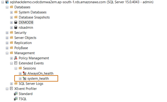 While preparing this article, I thought we have a system_health extended event for the AWS RDS SQL Server. To verify this, connect to the RDS instance in SSMS and navigate to Extended Events -> Sessions. Here, you can see the system_health extended event session is in a running state.