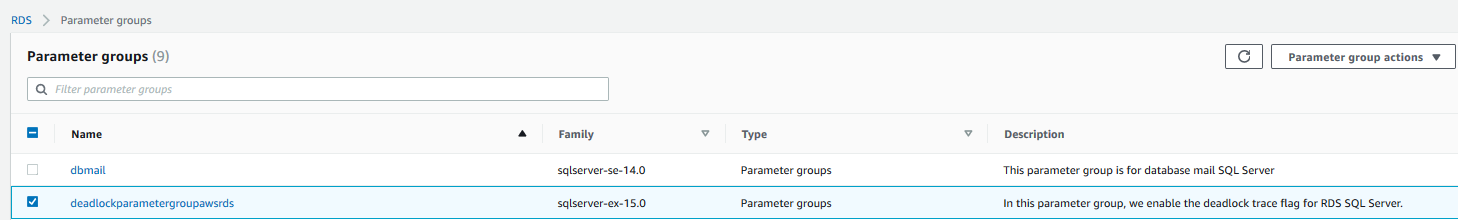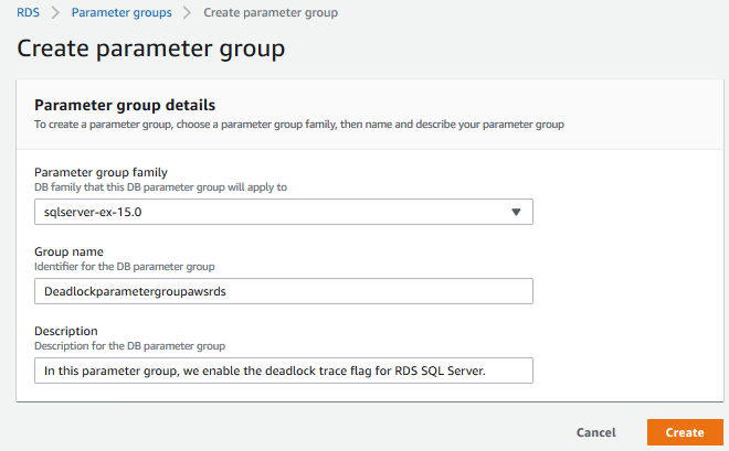 We cannot modify a default parameter group. Therefore, to enable the deadlock trace flag in the RDS instance, we modify a parameter configuration, go to the RDS dashboard, select the existing parameter group and click on the Create Parameter group.