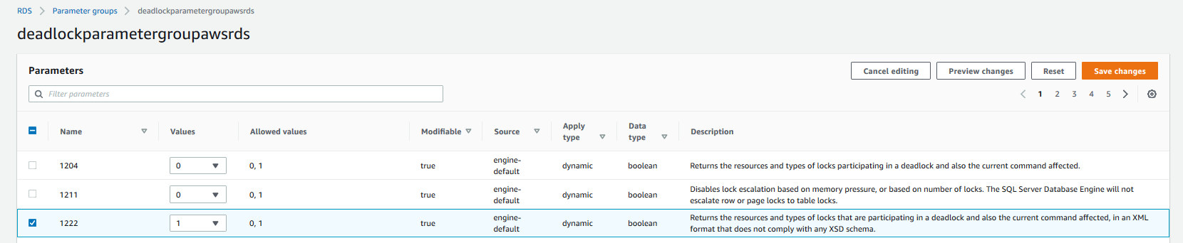 By default, the new parameter group is a copy of configurations from a default parameter group. For capturing deadlocks, edit the newly created parameter group and modify the value for trace flag 1222 from zero to one. It enables the trace flag parameter in the new parameter group.