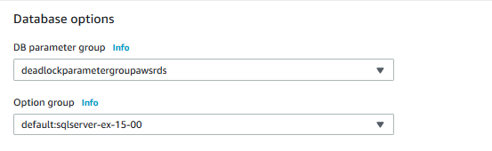 Save the changes. We have currently modified the trace flag configuration in the newly created parameter group; however, our RDS instance still runs with the default parameter group. Therefore, edit your AWS RDS SQL Server instance, select a new parameter group from the drop-down values, and assign the new parameter group in the database options section.