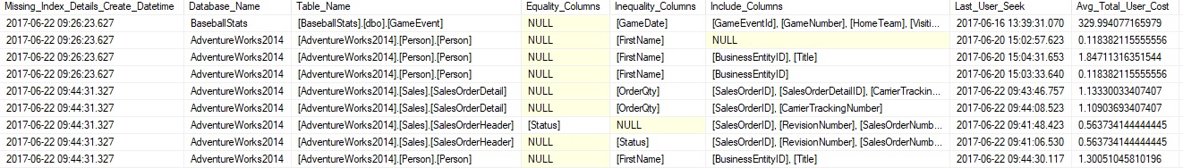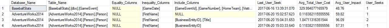 Included in this list is the query on Person.Person that we ran earlier, as well as a few other index suggestions on the same table, and an index relating to my baseball statistics database. A busy production server will likely have far more index suggestions, as well as a more significant volume of user seeks that could be applied to them.