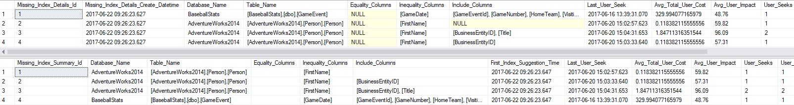 SELECT * FROM dbo.Missing_Index_Details; SELECT * FROM dbo.Missing_Index_Summary; |