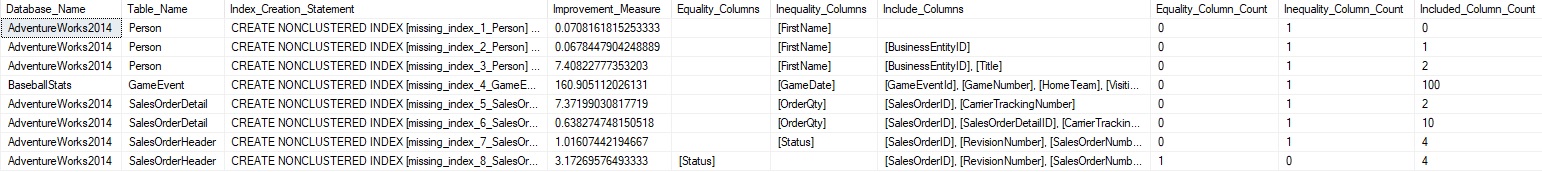 To provide a more interesting view, I’ll execute a variety of queries on AdventureWorks in order to cause some more missing index suggestions to be generated, including our test query from earlier. Once complete, we can execute the missing index collection proc and review the results. Here is the detail data that exists now: