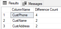 WITH src AS ( SELECT SUM(IIF(d.cols LIKE '%, CustId, %' , 1, 0)) AS CustId, SUM(IIF(d.cols LIKE '%, CustName, %' , 1, 0)) AS CustName, SUM(IIF(d.cols LIKE '%, CustAddress, %' , 1, 0)) AS CustAddress, SUM(IIF(d.cols LIKE '%, CustPhone, %' , 1, 0)) AS CustPhone FROM #diffcols d ) SELECT ca.col AS ColumnName, ca.diff AS [Difference Count] FROM src CROSS APPLY ( VALUES ('CustId ',CustId ), ('CustName ',CustName ), ('CustAddress ',CustAddress ), ('CustPhone ',CustPhone ) ) ca(col, diff) WHERE diff > 0 ORDER BY diff desc ; |