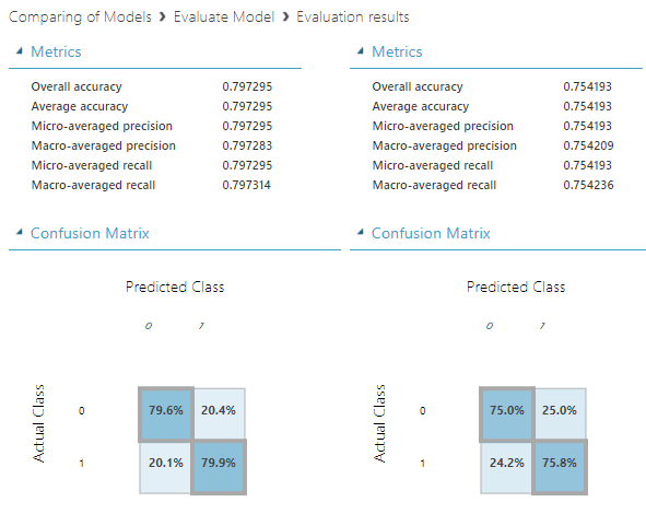 In this comparison too, the better algorithm is the Two-Class Decision Forest.