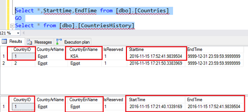We will discover that the data that existed before the record was updated was inserted into the historical table and we can found the StartTime and EndTime for this operation in the historical table: