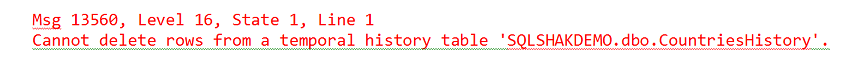USE SQLSHAKDEMO Go ---Creating a Temporal Table CREATE TABLE [dbo].[Countries]( [CountryID] [int] Primary KEY IDENTITY(1,1) NOT NULL, [CountryArName] [nvarchar](255) NULL, [CountryEnName] [varchar](255) NULL, [IsReserved] [bit] NOT NULL CONSTRAINT [DF_Countries_IsReserved] DEFAULT ((0)), [StartTime] DATETIME2 GENERATED ALWAYS AS ROW START HIDDEN NOT NULL, [EndTime] DATETIME2 GENERATED ALWAYS AS ROW END HIDDEN NOT NULL , PERIOD FOR SYSTEM_TIME (StartTime, EndTime) ) WITH(SYSTEM_VERSIONING=ON (HISTORY_TABLE=dbo.CountriesHistory)) Go |