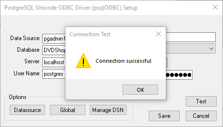 The dialog box named PostgreSQL Unicode ODBC Driver (pSQLODBC) Setup opens. We have already specified all required parameters, so we are changing the name of the database in the Database text box only. We are connecting to the DVDShop database so enter DVDShop in the Database textbox.