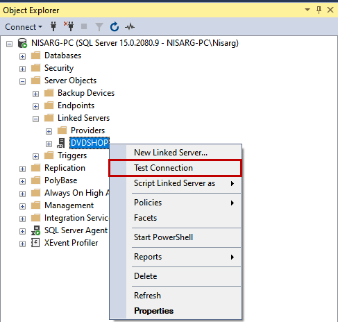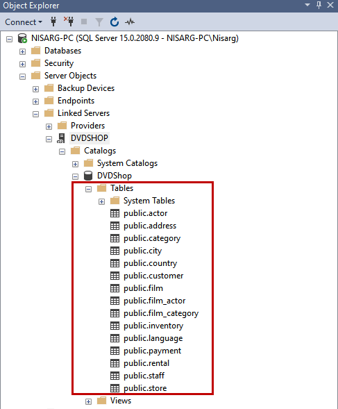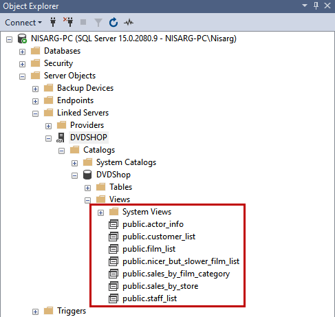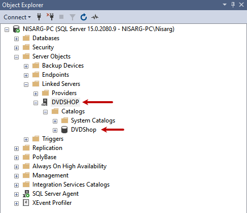 We can view the object created in the DVDShop database using DVDSHOP linked server. To do that, expand DVDSHOP 🡪 expand Catalogs.