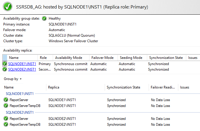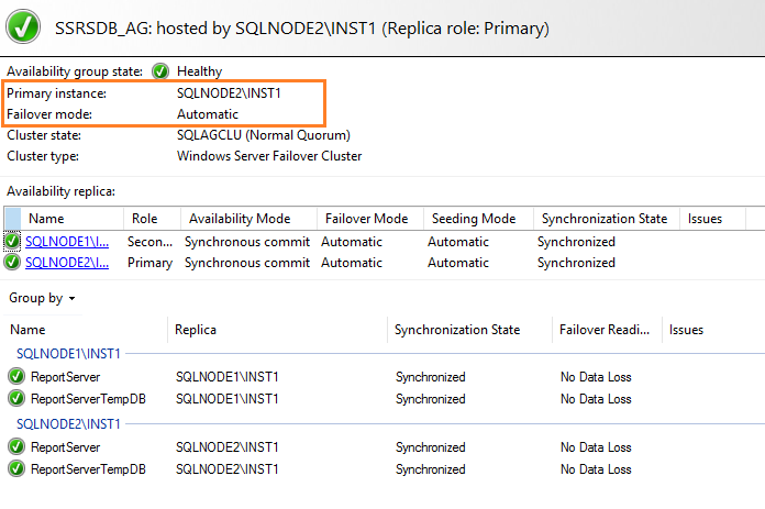 Our first test passed. AG dashboard is healthy for both SSRS databases after failover as well.