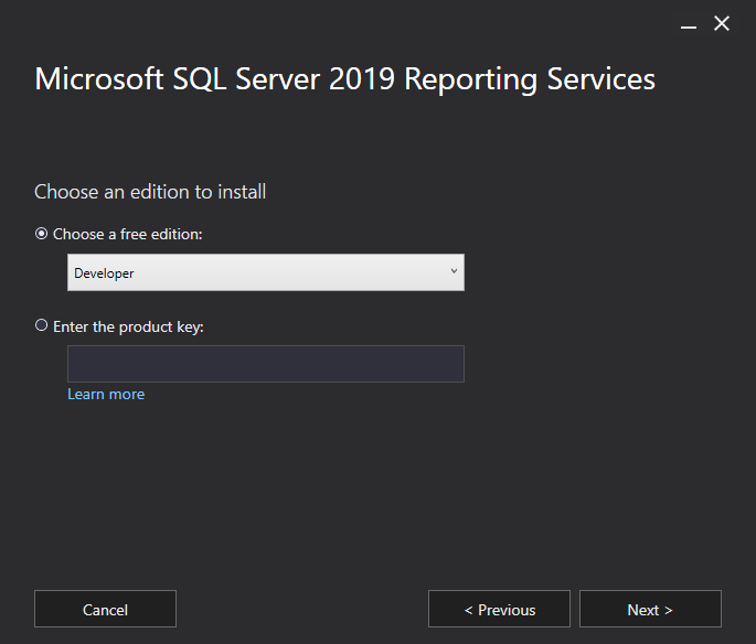 Choose an edition. We use the developer edition of SQL Server Reporting Services 2019.