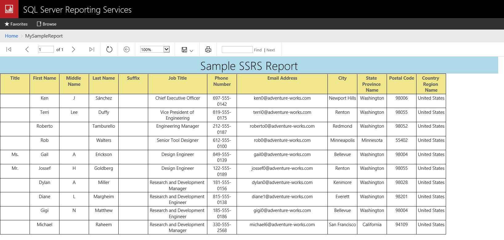 Launch the SSRS portal and view the sample report we deployed. It is also working as expected. It passes the second validation.