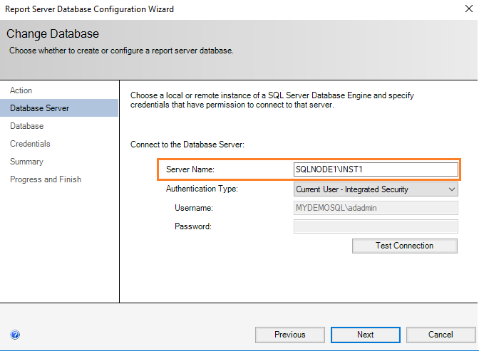 In the server name, specify the SQL listener that we created earlier for SSRS SQL Server Always On Availability Group. A SQL listener always points to the primary replica. Once we configure the listener in the report server configuration, in case of failover, it automatically connects to the databases on a new primary replica.