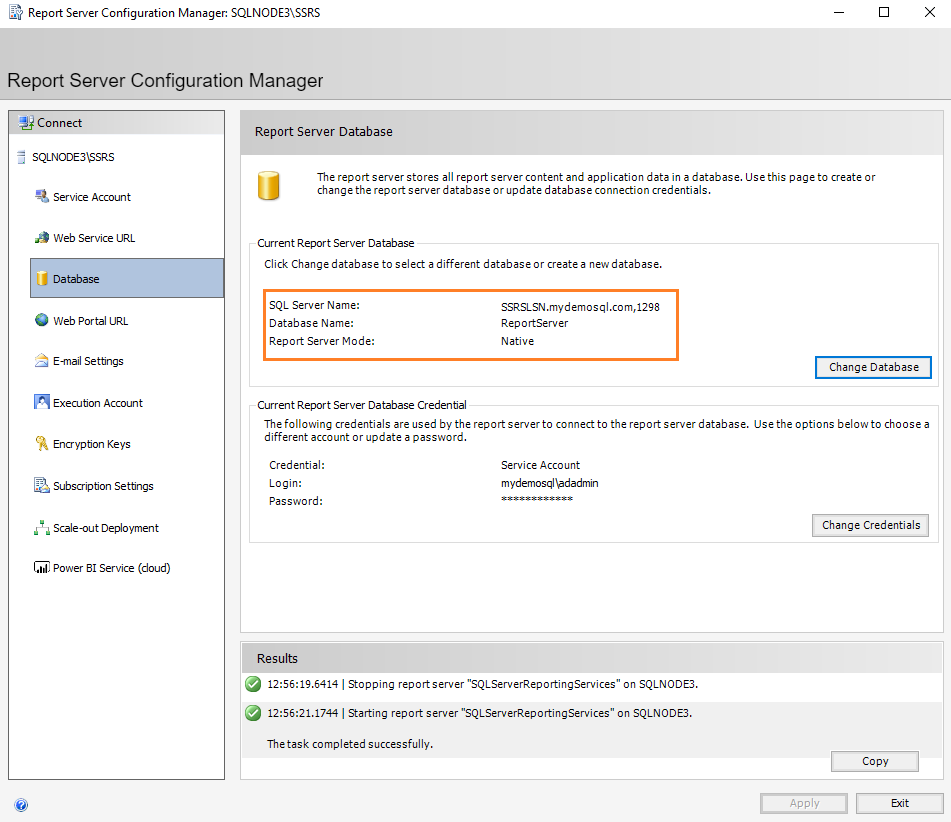 Verify your configurations in the report server database configuration. You can note here that it creates two SSRS databases – ReportServer and ReportServerTempDB