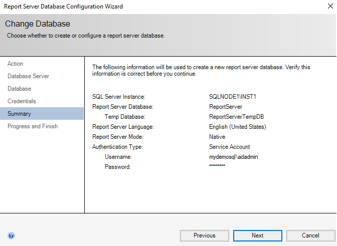 Service account configuration: In the service account page, specify a domain account to run the reporting service. It automatically restarts the reporting services once you apply the service accounts