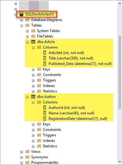 Let us first create a sample database called SQLDevArticlesV2 by running the following SQL script: