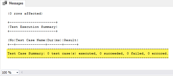 Since there are no unit tests written yet, so no results to see, however, it confirms that tSQLt framework is readily accepting unit tests.
