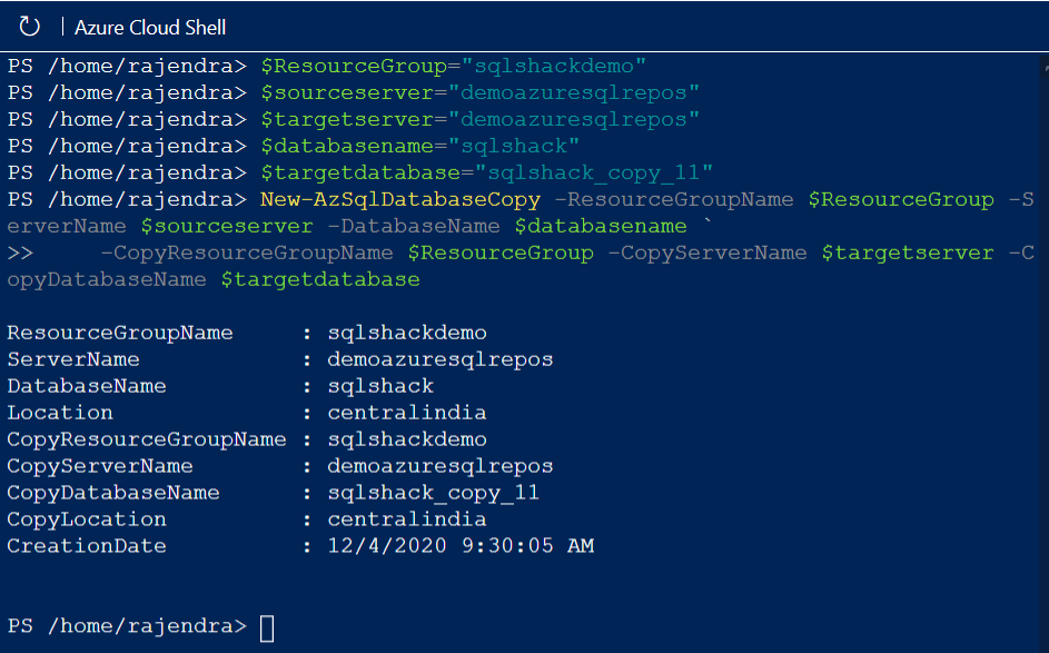 $ResourceGroup="sqlshackdemo" $sourceserver="demoazuresqlrepos" $targetserver="demoazuresqlrepos" $databasename="sqlshack" $targetdatabase="sqlshack_copy_11" New-AzSqlDatabaseCopy -ResourceGroupName $ResourceGroup -ServerName $sourceserver -DatabaseName $databasename ` -CopyResourceGroupName $ResourceGroup -CopyServerName $targetserver -CopyDatabaseName $targetdatabase |