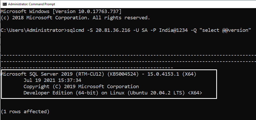 sqlcmd -S 20.81.36.216 -U SA -P India@1234 -Q "select @@version" |