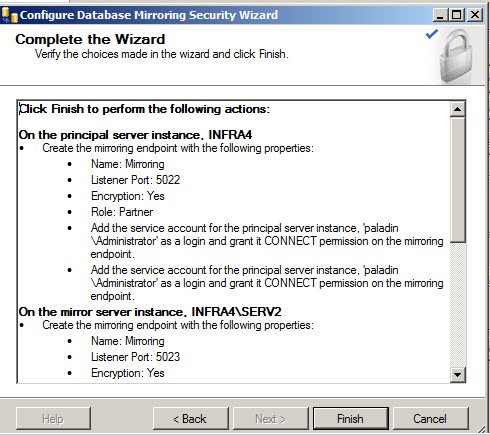 Figure 7. Mirror informationIf you selected the option to use a Witness. You will be required to press the connect button and select the credentials to connect to the witness Server. Also, select the listener port and the Endpoint name. If you are using the same server with different instances, a different port should be used for each server.