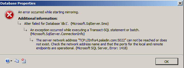 Error 1418, The network address can not be reached or does not exist. Check the network address name and that the ports for the local and remote endpoints are operational.