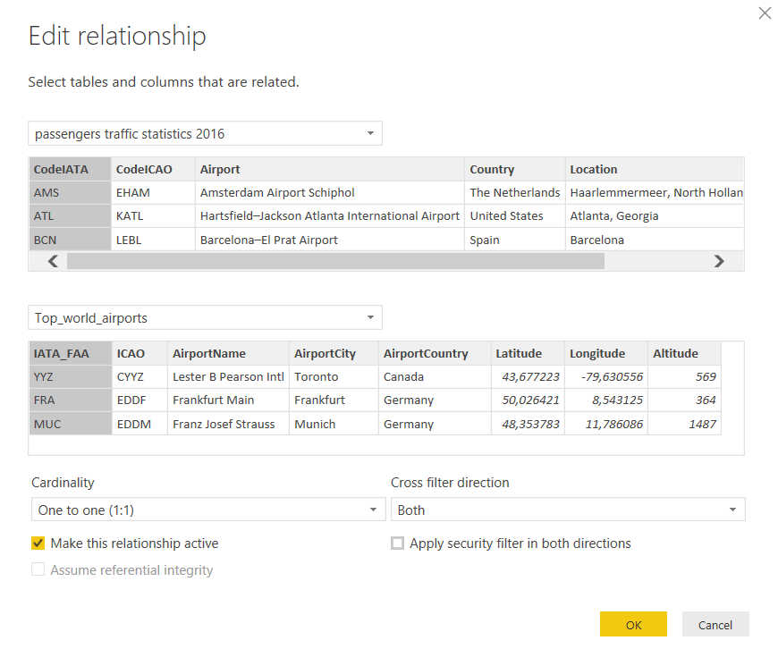 This could work for us, although I prefer the standard three-letters IATA code. So double click on the connection’s yellow line and in the Edit Relationship dialog select the IATA field from both datasets, then click OK. Don’t forget to save your file and get back to the report page.