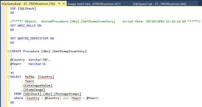 Now that our raw data is present within the “PostageStamps” table, we really must create a stored procedure that will be utilized to extract the necessary data for our reporting. Further, we want to add a simple predicate to the code that will permit the end user to pass the year and the country name of the stamps that he or she wishes to view (see above). The code snippet may be seen in Addenda 2