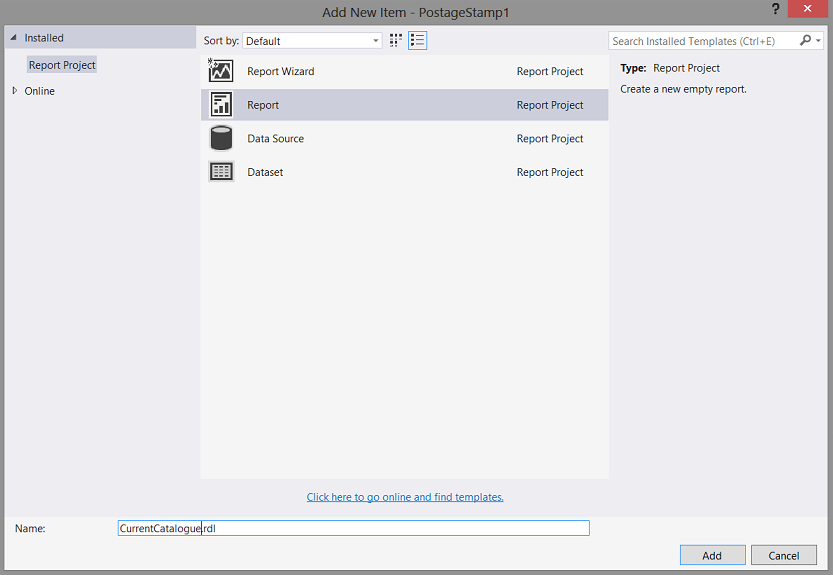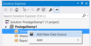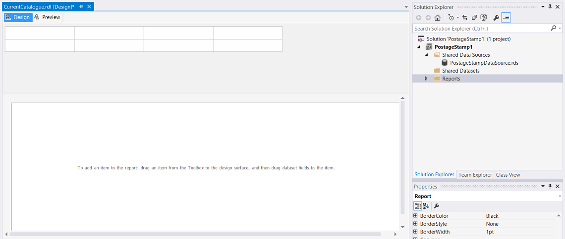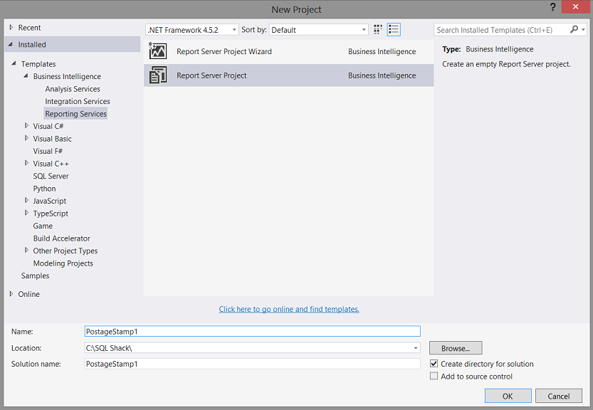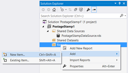 We create a new “New Report Server” project and give it the name “PostageStamp1”. We click “OK” to create the project (see above).