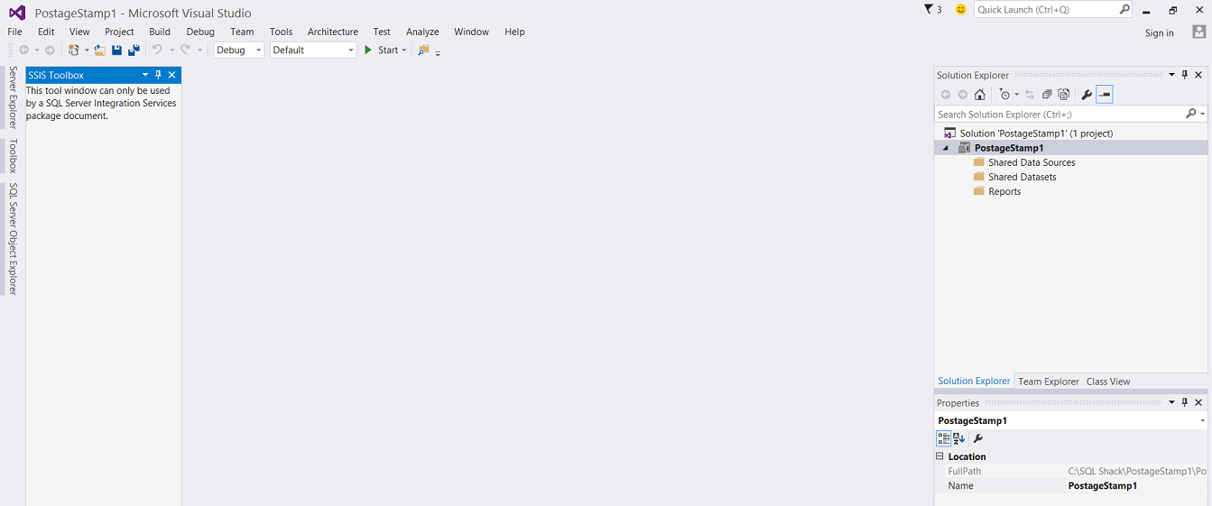 We begin by bringing up Visual Studio 2015 or SQL Server Data Tools 2010 or greater.