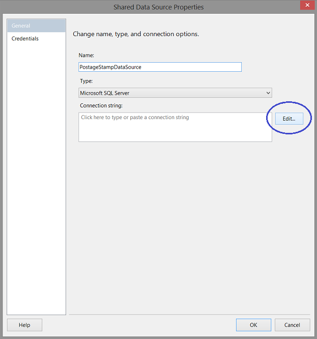We give our proposed data source a name and click the “Edit” button to create the connection string (see above).