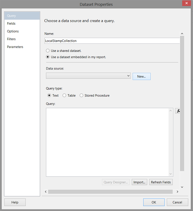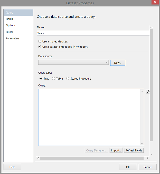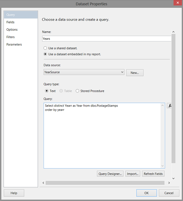 The “Dataset Properties” dialogue box opens. We give our dataset the name “Years”. The values with in this new dataset “Years” will be utilized to provide to the user when he or she selects the “stamp year” to view. We click the “New” button to create a new local data source. This local data source will utilize the shared data source that we recently created. As I have mentioned in past “get togethers”, having a local dataset source is advantageous as it permits report specific customization.
