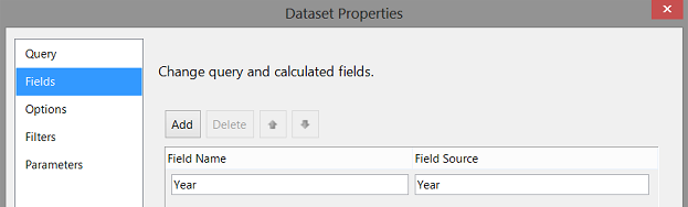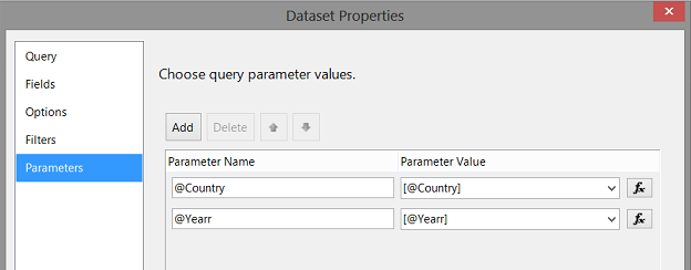 Our last task is to link the dataset to the parameters “year” and “country”. We click on the “Parameters” tab and we note that both parameters appear (see above). The “Parameter Name” refers to the actual parameters that we just created and the “Parameter Value” will be set at the run time when the user selects a year and country. It is these argument values that will be passed to our stored procedure.