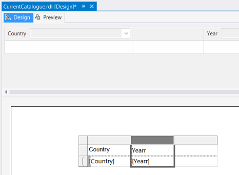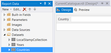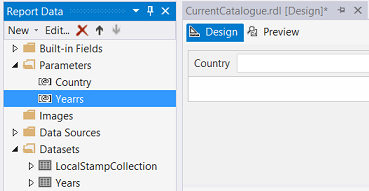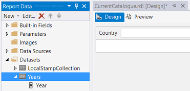 As the report query expects the end user to pass through a country name and a year, we must create two dataset. The first will contain a complete list of the distinct countries within the “PostageStamps” table and the other, a complete list of distinct “years” that currently exist within the same table. The arguments selected by the user will then be passed to the query / stored procedure.