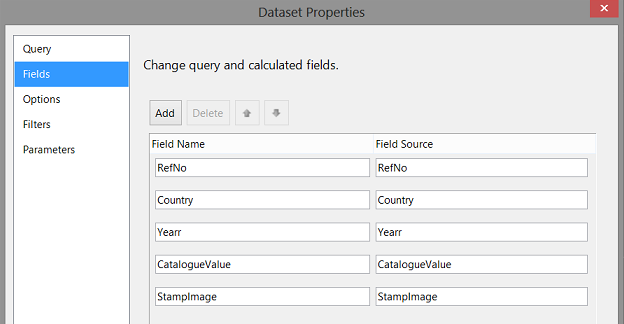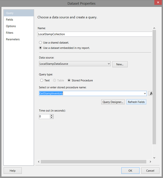 We are returned to the “Dataset Properties” dialogue box. We select “Stored Procedure” for the “Query type” and we select the Stored Procedure “GetStampInventory” (which we created above). We click “OK” to continue (see above).