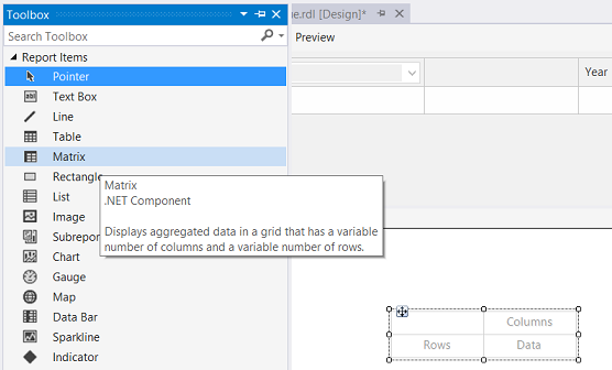Having constructed the data extract apparatus, we are now in the position to add report controls to our drawing surface. We drag a “Matrix” from the tool box on to our drawing surface (see above)