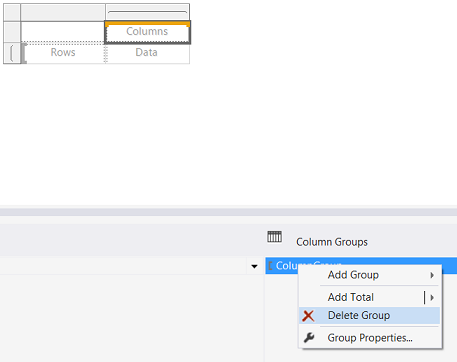 This completed, our next task is to remove the matrix column grouping as we shall NOT be utilizing it. We right click on the “ColumnGroup” tab (see above) and select “Delete Group”.