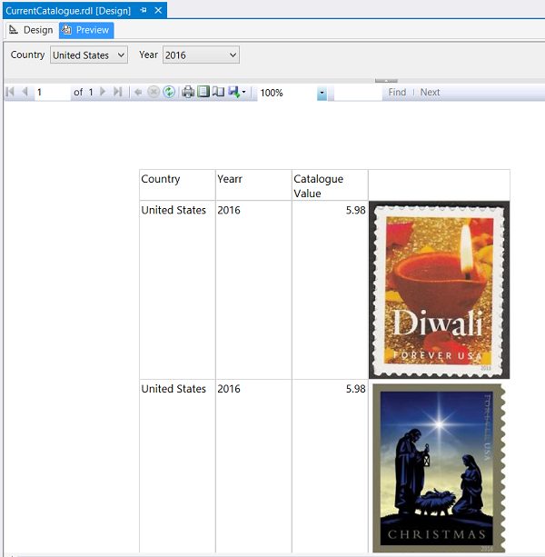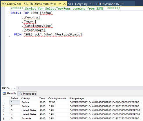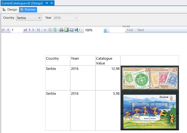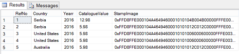 We begin by creating a table called “PostageStamps”. The astute reader will note that the image field has been defined as varbinary(max). Other fields include the country of issue (Country), the year that the stamp was issued (Yearr), the current catalog value (CatalogueValue) and last but not least, an identity field (RefNo), which we shall use as a grouping and sorting field within our reporting.