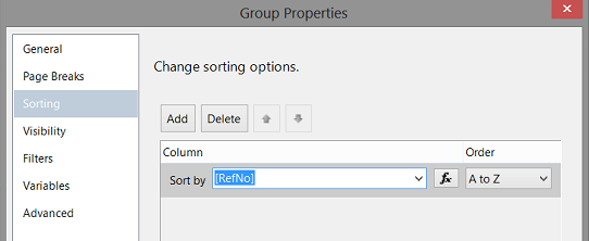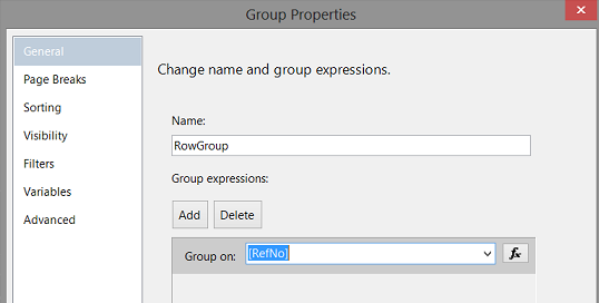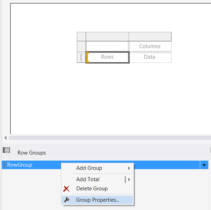 We must now set our row grouping. We right click upon the “RowGroup” and select “Group Properties” (see below).