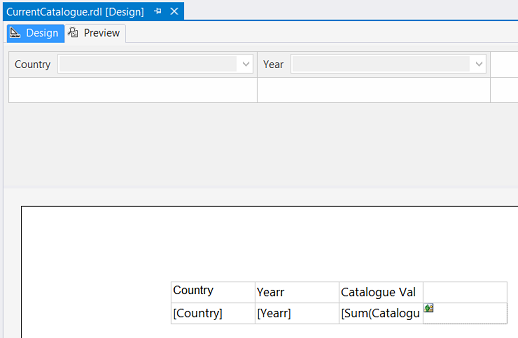 We select the “Report” option and give our proposed report the name “CurrentCatalogue” (see above). We click the “Add” button and we are returned to our design surface (see below).